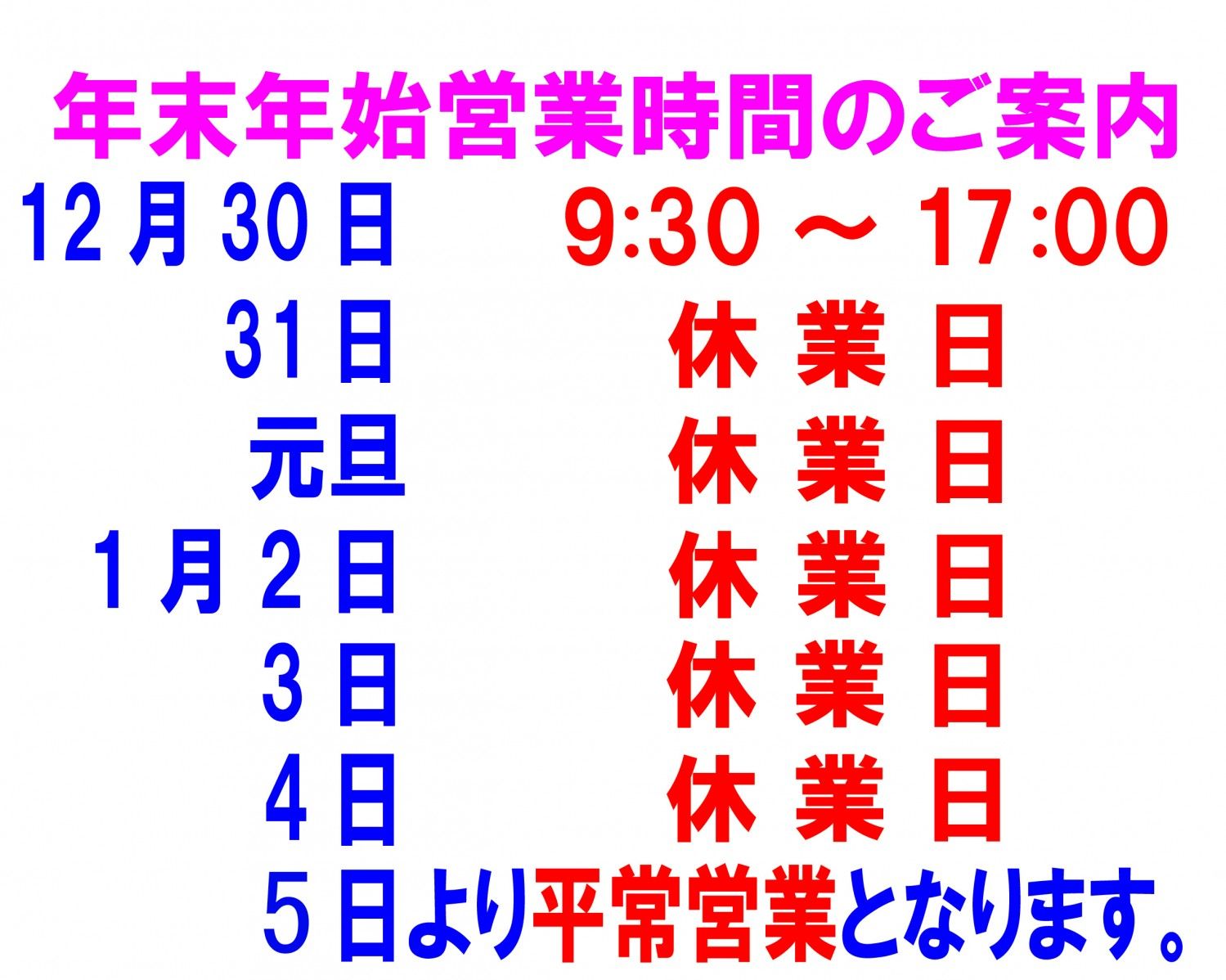 年末年始営業時間のご案内。